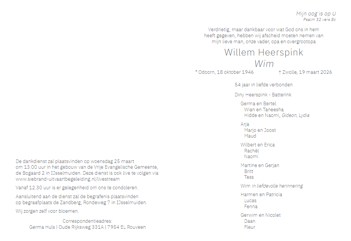 Rouwkaart – Dhr. W. Heerspink
